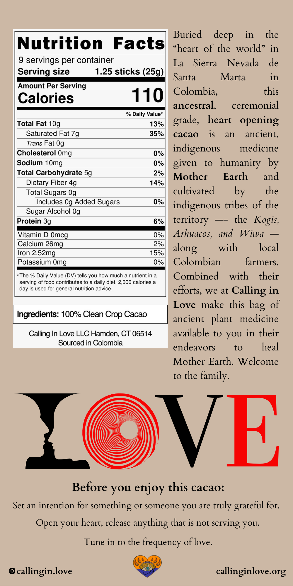 Buried deep in the "heart of the world" in La Sierra Nevada de Santa Marta in Colombia. This ancestral, ceremonial grade, heart-opening cacao is an ancient, indigenous medicine given to humanity by Mother Earth and cultivated by the indigenous tribes of the territory -- the Kogis, Arhuacos, and Wiwa -- along with local Colombian farmers. Combined with their efforts, we at Calling In Love make this bag of ancient plant medicine available to you in their endeavors to heal Mother Earth. Welcome to the family.